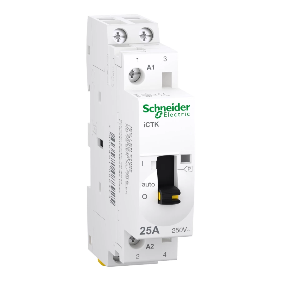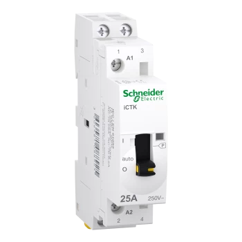 Stycznik modułowy z ręcznym sterowaniem, Acti9 iCTK50r-25-20-230 25A 2NO 5060Hz 230/240 VAC, bez możliwości rozbudowy o styki pomocnicze o numerze katalogowym A9C41225 w kategorii Styczniki instalacyjne, Styczniki. Produkt wyprodukowany przez markę SCHNEIDER ELECTRIC.