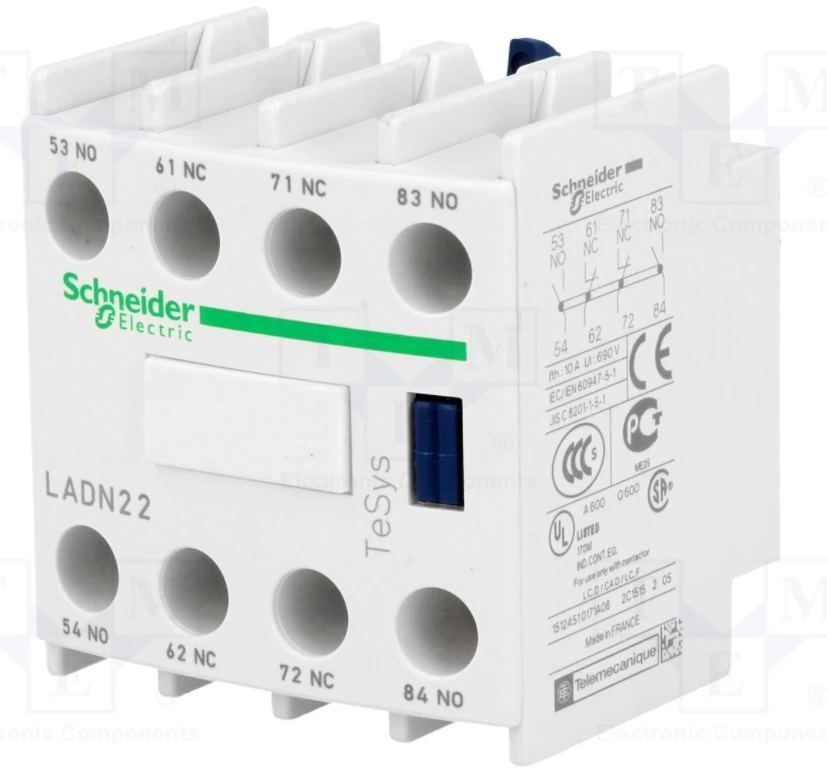 Blok styków pomocniczych wyprzedzających LC1 2NO 2NC zaciski skrzynkowe o numerze katalogowym LADN22 w kategorii Styki pomocnicze, Sterowanie i zabezpieczenie silników. Produkt wyprodukowany przez markę SCHNEIDER ELECTRIC.