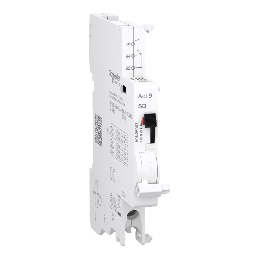 Styk sygnalizacyjny Acti9 SD (wskazanie wyzwolenia elektrycznego), 1 przemienny (1 CO), zaciski dolne o numerze katalogowym A9N26907 w kategorii Styki pomocnicze, Sterowanie i zabezpieczenie silników. Produkt wyprodukowany przez markę SCHNEIDER ELECTRIC.