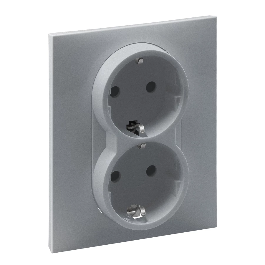 Gniazdo SCHUKO 2x2P+Z z przesłoną - zaciski automatyczne (monoblok), ALUMINIUM SUNO o numerze katalogowym 721326 w kategorii Gniazda podtynkowe, Gniazda instalacyjne. Produkt wyprodukowany przez markę LEGRAND, seria SUNO2.