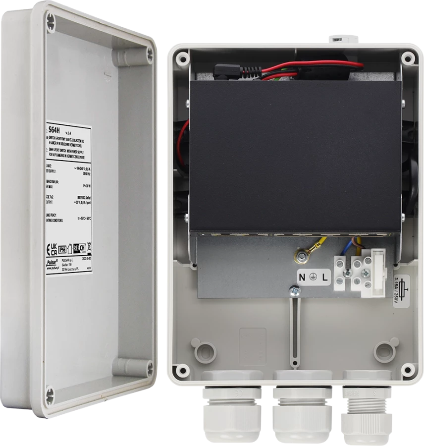 SWITCH 6-PORTOWY S64H Z ZASILACZEM DO 4 KAMER IP W OBUDOWIE HERMETYCZNEJ 6 PORTÓW (4XPOE + 2XUPLINK)