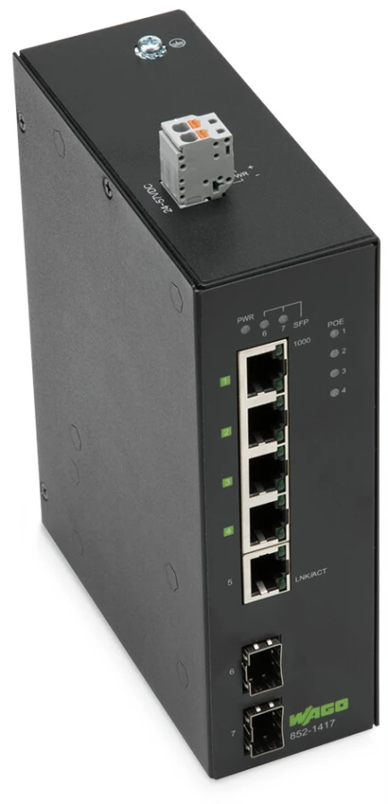 switch przemysłowy ECO; 5 portów 1000 Base-T; 1000BASE-SX/LX, 2 gniazda; rozszerzony zakres temperatury; 4 * Power over Ethernet