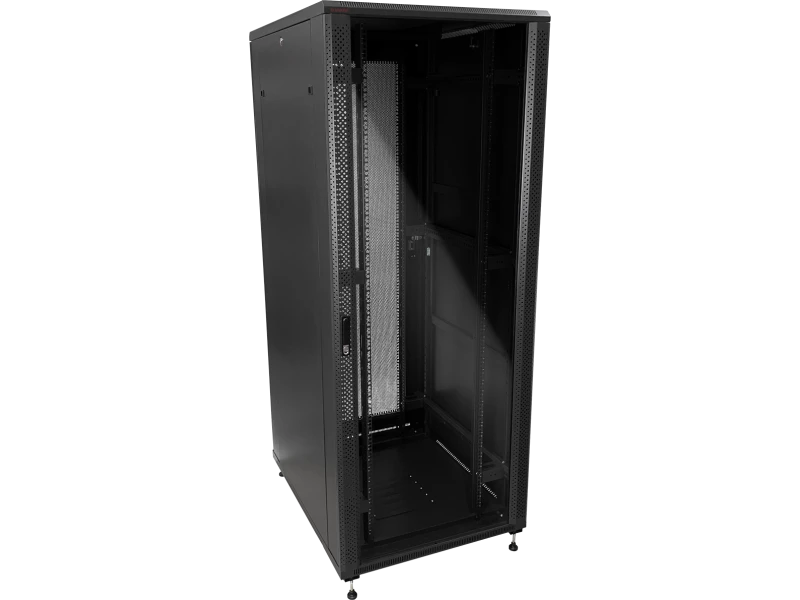 Szafa serwerowa 42U 19" 600x1000, drzwi przednie szklane, drzwi tylne stalowe perforowane, zamek, 4 belki nośne, 4 regulowane stopki, do samodzielnego montażu, kolor czarny o numerze katalogowym SS-42U-600-1000-02-C w kategorii Szafy i wyposażenie IT, Infrastruktura IT. Produkt wyprodukowany przez markę Q-LANTEC.