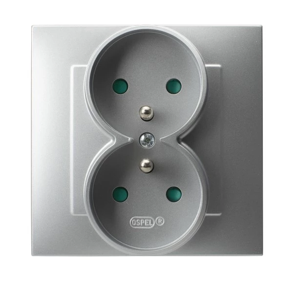 Gniazdo podwójne z uziemieniem z przesłonami torów prądowych, kompletne z ramką - SREBRO o numerze katalogowym   GP-2ZZP/18 w kategorii Gniazda instalacyjne>Gniazda podtynkowe. Produkt wyprodukowany przez markę OSPEL, seria SZAFIR.