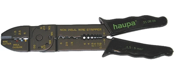 Praska 0,75-6mm do izolowanych i nieizolowanych końcówek. obcinak śrub z gwintem od M2,5-M5, zdejmowanie izolacji 0,75-6mm o numerze katalogowym 210808 w kategorii Praski ręczne, Praski i kleszcze. Produkt wyprodukowany przez markę HAUPA.