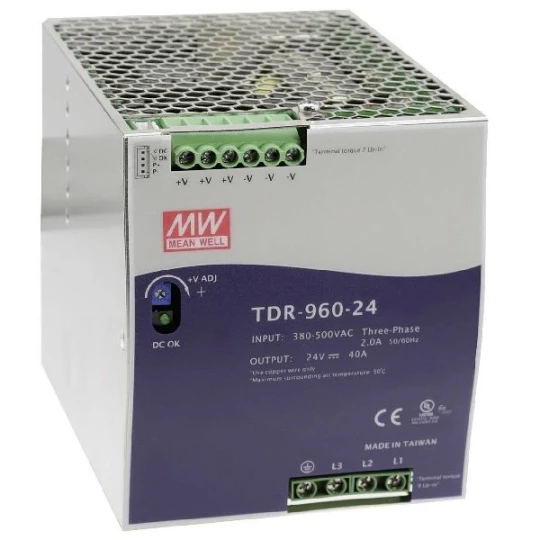Zasilacz na szynę DIN 3-fazowy 960W 24V o numerze katalogowym TDR-960-24 w kategorii Zasilacze na szynę DIN, Zasilacze. Produkt wyprodukowany przez markę MEAN WELL, seria TDR.