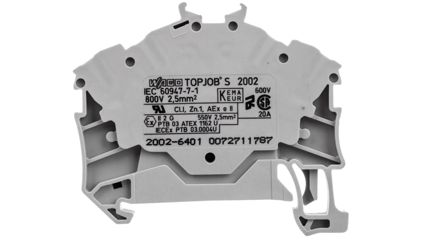 złączka przelotowa 4-przewodowa; 2,5 mm²; do zastosowań Ex e II; opis z boku i na środku; na szynę TS 35 x 15 i 35 x 7,5; Push-in CAGE CLAMP®; 2,50 mm²; szary