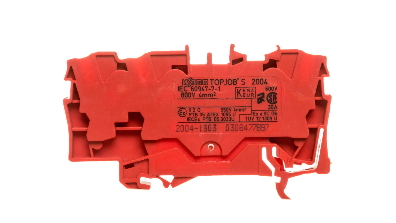 złączka przelotowa 3-przewodowa; 4 mm²; do zastosowań Ex e II; opis z boku i na środku; na szynę TS 35 x 15 i 35 x 7,5; Push-in CAGE CLAMP®; 4,00 mm²; czerwony