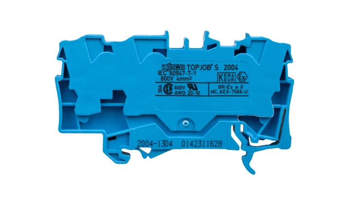 złączka przelotowa 3-przewodowa; 4 mm²; do zastosowań Ex e II oraz Ex i; opis z boku i na środku; na szynę TS 35 x 15 i 35 x 7,5; Push-in CAGE CLAMP®; 4,00 mm²; niebieski