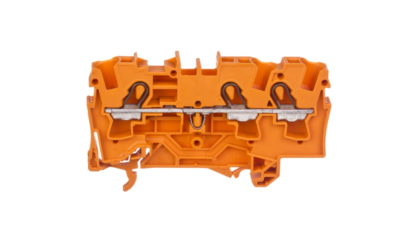 złączka przelotowa 3-przewodowa; 4 mm²; do zastosowań Ex e II; opis z boku i na środku; na szynę TS 35 x 15 i 35 x 7,5; Push-in CAGE CLAMP®; 4,00 mm²; pomarańczowy
