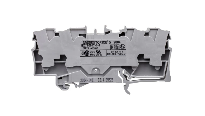 Złączka 4-przewodowa przelotowa 4 mm do zastosowań Ex e II opis z boku i na środku na szynę TS 35 x 15 i 35 x 7,5 Push-in CAGE CLAMP 4,00 mm szara o numerze katalogowym 2004-1401 w kategorii Złączki i zaciski ochronne sprężynowe, Złączki listwowe sprężynowe. Produkt wyprodukowany przez markę WAGO, seria TOPJOB® S.