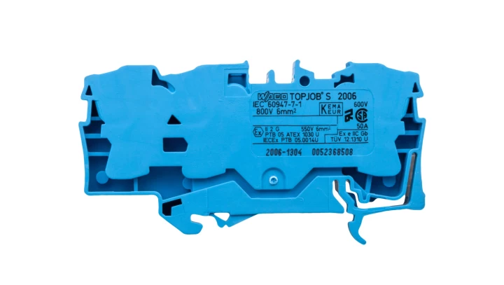 złączka przelotowa 3-przewodowa; 6 mm²; do zastosowań Ex e II oraz Ex i; opis z boku i na środku; na szynę TS 35 x 15 i 35 x 7,5; Push-in CAGE CLAMP®; 6,00 mm²; niebieski