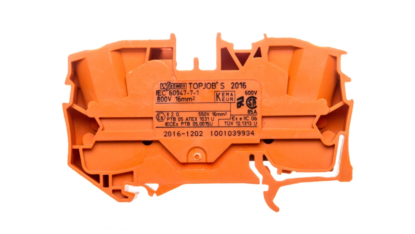 złączka przelotowa 2-przewodowa; 16 mm²; do zastosowań Ex e II; opis z boku i na środku; na szynę TS 35 x 15 i 35 x 7,5; Push-in CAGE CLAMP®; 16,00 mm²; pomarańczowy