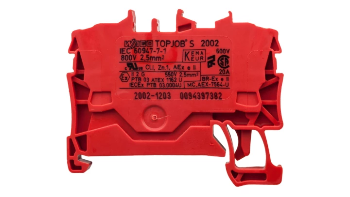 złączka przelotowa 2-przewodowa; 2,5 mm²; do zastosowań Ex e II; opis z boku i na środku; na szynę TS 35 x 15 i 35 x 7,5; Push-in CAGE CLAMP®; 2,50 mm²; czerwony