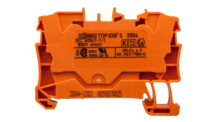 złączka przelotowa 2-przewodowa; 4 mm²; do zastosowań Ex e II; opis z boku i na środku; na szynę TS 35 x 15 i 35 x 7,5; Push-in CAGE CLAMP®; 4,00 mm²; pomarańczowy
