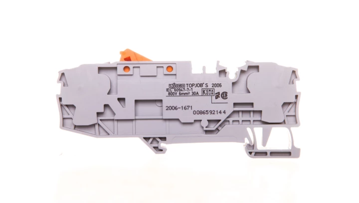 złączka rozłączalna 2-przewodowa; z uchylnym łącznikiem nożowym; z możliwością pomiaru; uchwyt łącznika nożowego pomarańczowy; na szynę TS 35 x 15 i 35 x 7,5; 6 mm²; Push-in CAGE CLAMP®; 6,00 mm²; szary