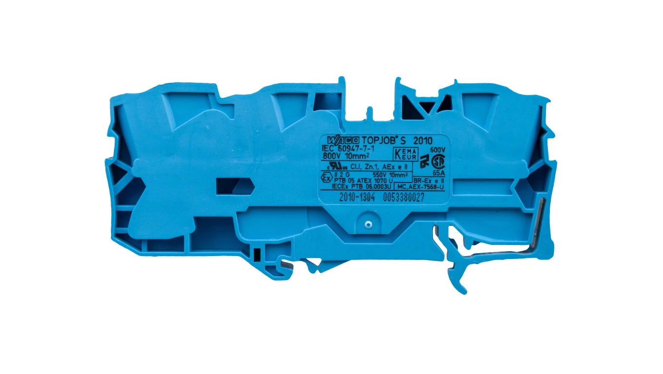 złączka przelotowa 3-przewodowa; 10 mm²; do zastosowań Ex e II oraz Ex i; opis z boku i na środku; na szynę TS 35 x 15 i 35 x 7,5; Push-in CAGE CLAMP®; 10,00 mm²; niebieski