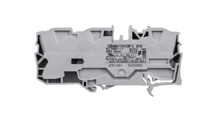 złączka przelotowa 3-przewodowa; 10 mm²; do zastosowań Ex e II; opis z boku i na środku; na szynę TS 35 x 15 i 35 x 7,5; Push-in CAGE CLAMP®; 10,00 mm²; szary