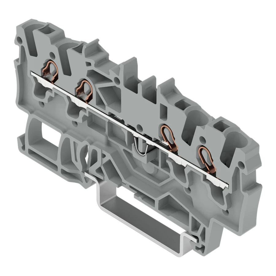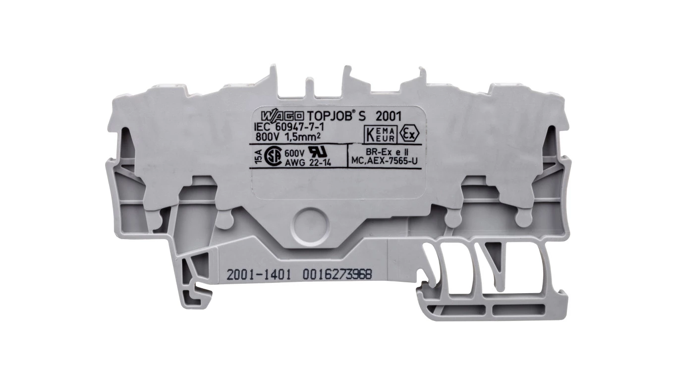 Złączka 4-przewodowa przelotowa 1,5 mm do zastosowań Ex e II opis z boku i na środku na szynę TS 35 x 15 i 35 x 7,5 Push-in CAGE CLAMP 1,50 mm szara o numerze katalogowym 2001-1401 w kategorii Złączki i zaciski ochronne sprężynowe, Złączki listwowe sprężynowe. Produkt wyprodukowany przez markę WAGO, seria TOPJOB® S.