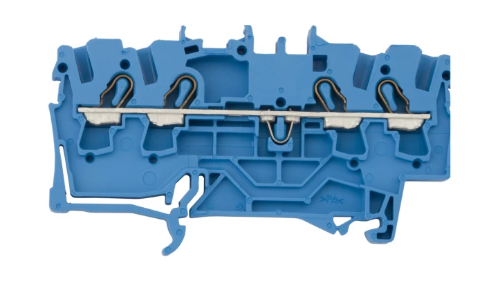 Złączka 4-przewodowa przelotowa 2,5 mm do zastosowań Ex e II oraz Ex i opis z boku i na środku na szynę TS 35 x 15 i 35 x 7,5 Push-in CAGE CLAMP 2,50 mm niebieski o numerze katalogowym 2002-1404 w kategorii Złączki i zaciski ochronne sprężynowe, Złączki listwowe sprężynowe. Produkt wyprodukowany przez markę WAGO, seria TOPJOB® S.