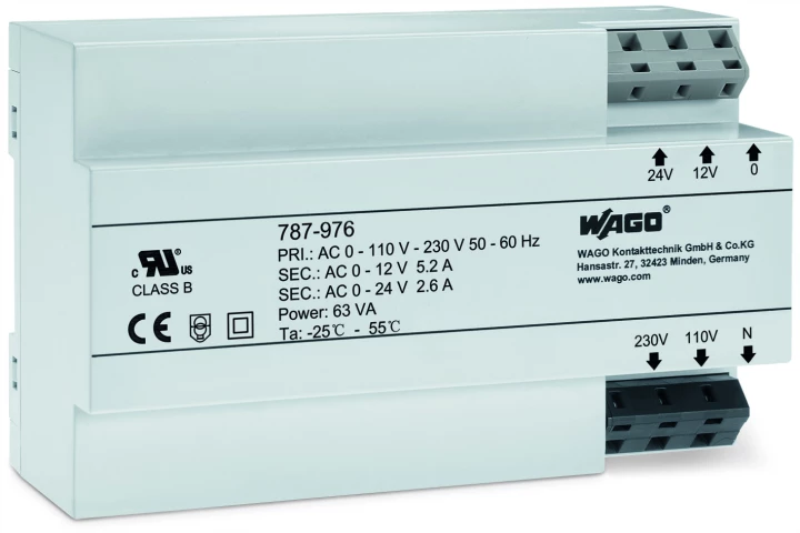 zasilacz transformatorowy; napięcie wejściowe 230 V AC; napięcie wyjściowe 12-24 V AC; moc wyjściowa 63 VA