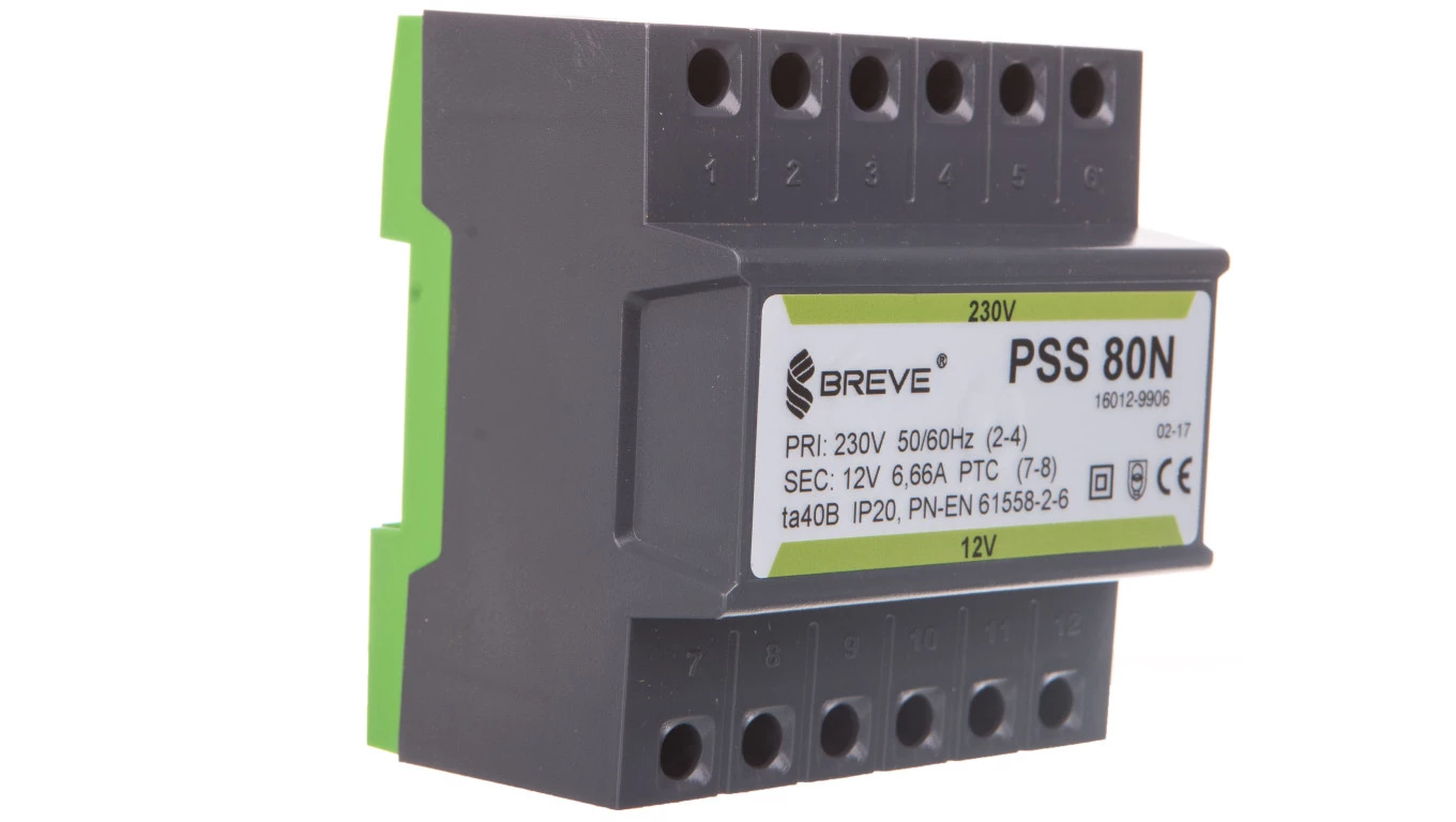 Transformator jednofazowy PSS 80N 230/12V IP30 na szynę DIN TH-35 w obudowie modułowej o numerze katalogowym 16012-9906 w kategorii Transformatory z mocowaniem, Transformatory. Produkt wyprodukowany przez markę BREVE, seria PSS.