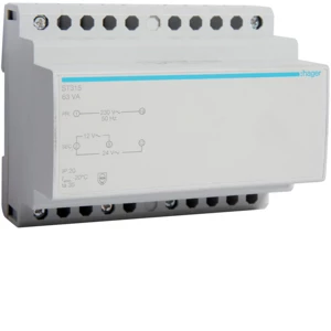 Transformator bezpieczeństwa, 12V/5, 25A lub 24V/2, 63A o numerze katalogowym ST315 w kategorii Pozostałe, Niesklasyfikowane. Produkt wyprodukowany przez markę HAGER.