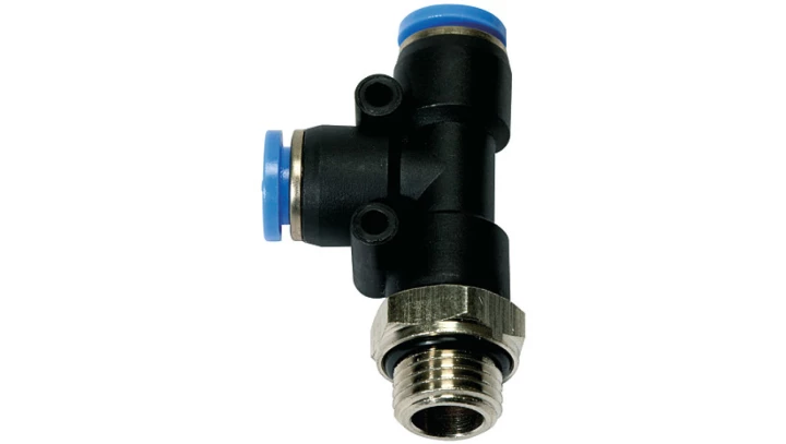 Trójnik wtykowy T obrotowy z tworzywa sztucznego do węża 6, gwint boczny G3/8z, 129.038-6