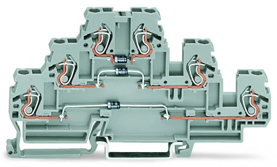 złączka do zabudowy elementów; 3-piętr.; z 3 diodami 1N4007; anody po prawej; na szynę TS 35 x 15 i 35 x 7,5; 2,5 mm²; CAGE CLAMP®; szary