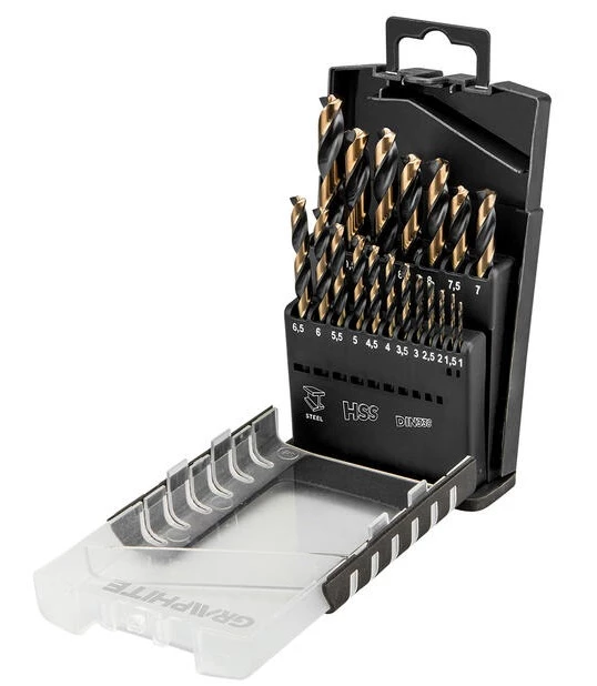 WIERTŁA DO METALU HSS-CNC, 124°, "PRO-TEC", 1.0-10.0 MM, ZESTAW 19 SZT. GRAPHITE