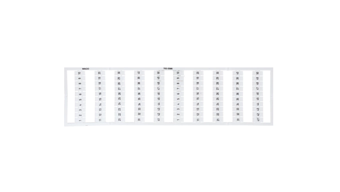 Mata oznacznikowa WMB, jako karta, z nadrukiem, 1 ... 50 (2x), z możliwością rozciągnięcia z 5 mm do 5,2 mm, nadruk poziomo, do montażu zatrzaskowego, biały o numerze katalogowym   793-5566 w kategorii Złączki listwowe sprężynowe>Oznaczniki do złączek sprężynowych. Produkt wyprodukowany przez markę WAGO.