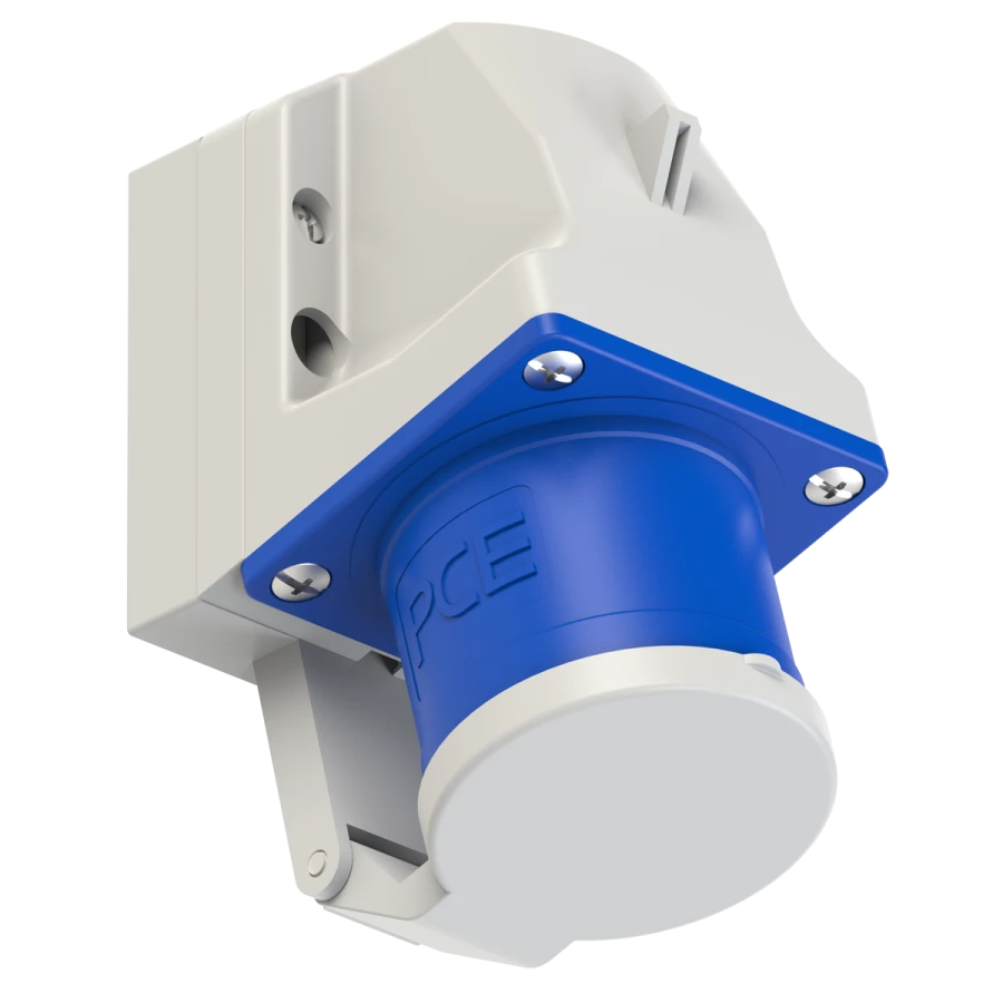 Wtyczka odbiornikowa (stała) 32A 2P+Z 230V z klapką IP44 o numerze katalogowym 523-6D w kategorii Wtyki stałe, Wtyki siłowe. Produkt wyprodukowany przez markę PCE.