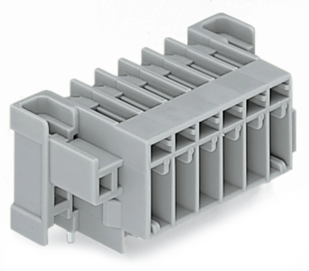wtyk THT; pin lutowniczy 1,0 x 1,0 mm; konstrukcja kątowa; kołnierz przepustowy; raster 5 mm; 12-bieg.; szary