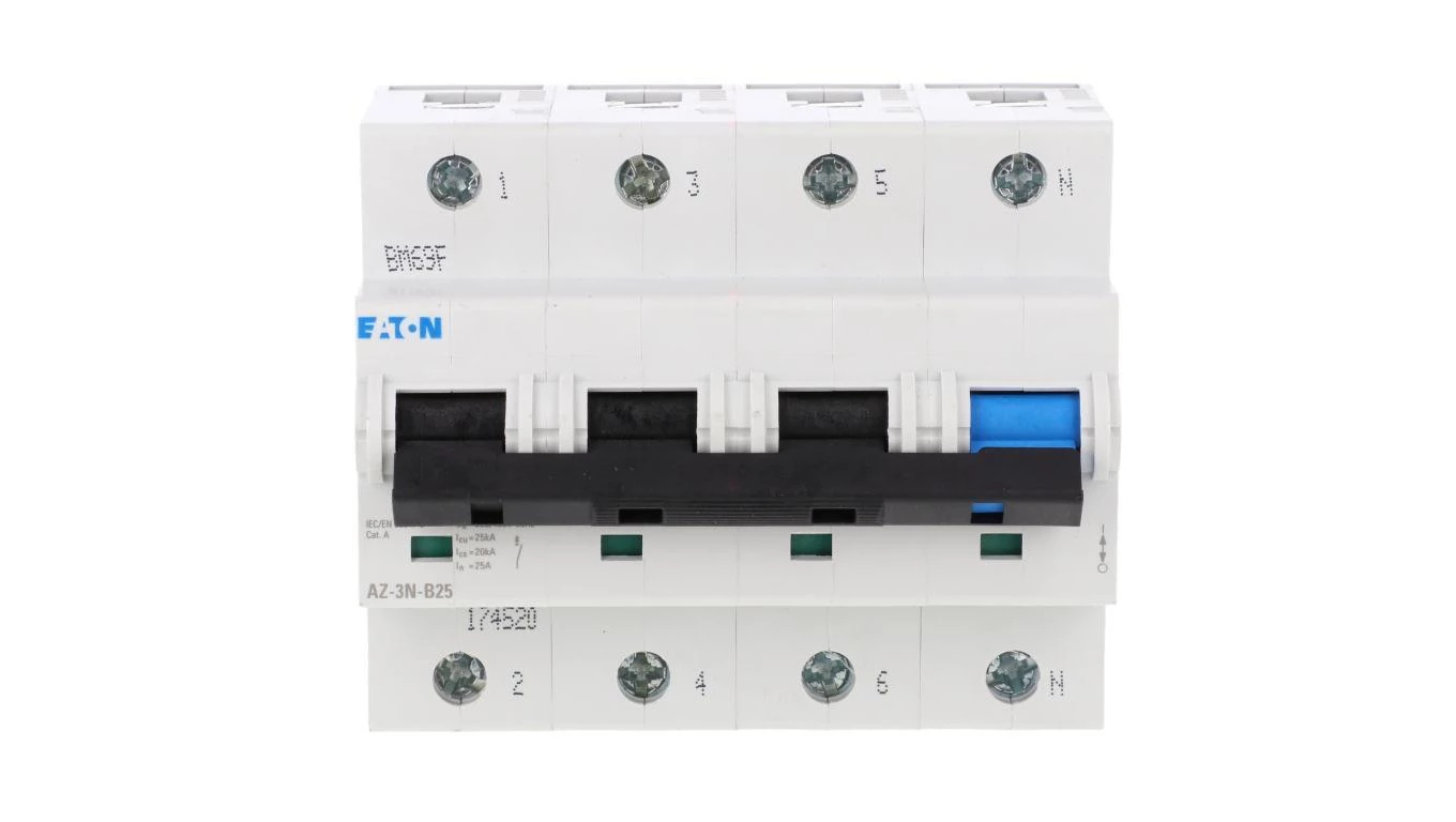 Wyłącznik nadprądowy 25kA, In=25A, charakterystyka B. 3+N biegunowy. AZ-3N-B25 o numerze katalogowym   174520 w kategorii Wyłączniki nadprądowe>Wyłączniki nadprądowe 25kA. Produkt wyprodukowany przez markę EATON, seria AZ.
