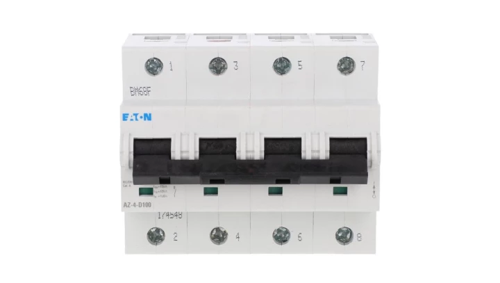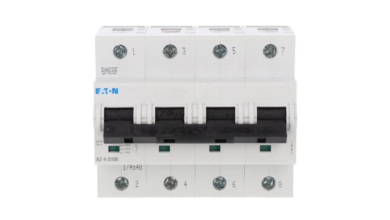 Wyłącznik nadprądowy 25kA, In=100A, charakterystyka D. 4-biegunowy. AZ-4-D100 o numerze katalogowym   174548 w kategorii Wyłączniki nadprądowe>Wyłączniki nadprądowe 25kA. Produkt wyprodukowany przez markę EATON, seria AZ.