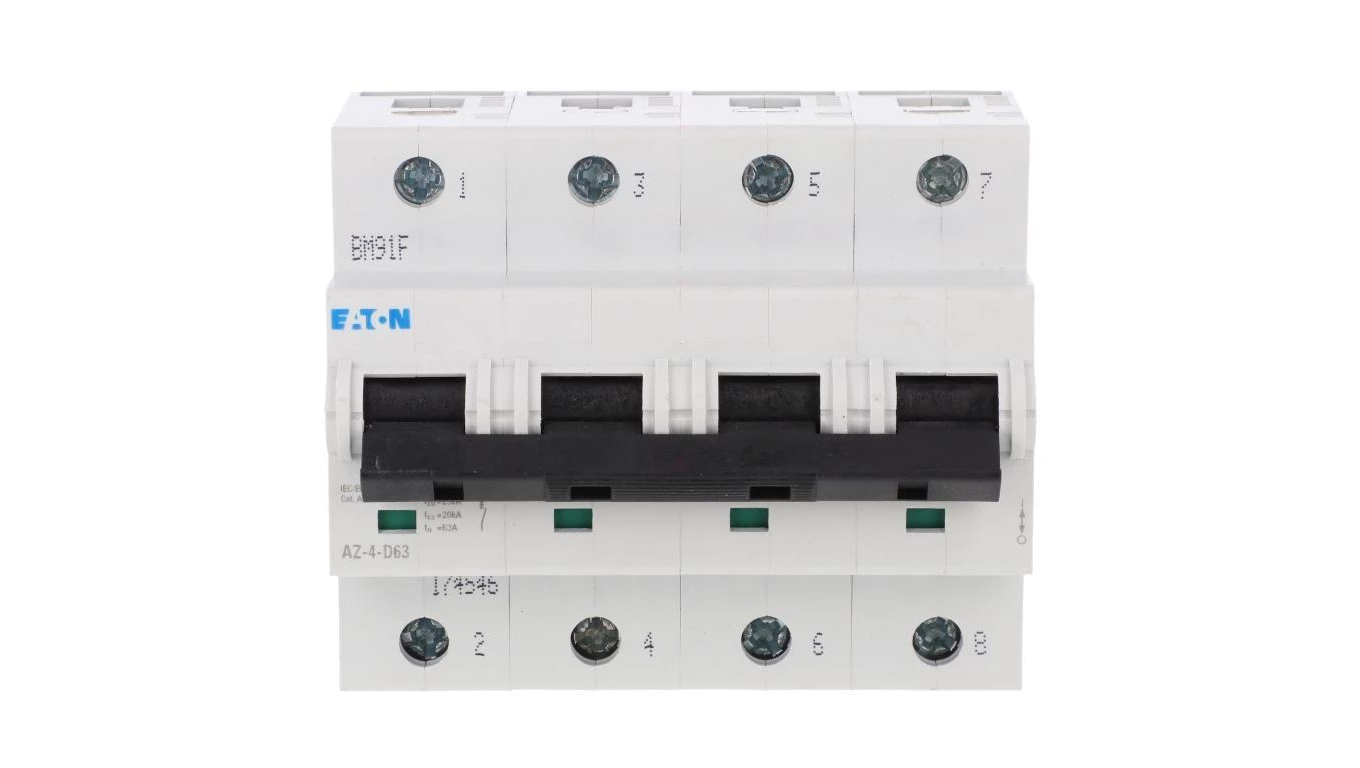 Wyłącznik nadprądowy 25kA, In=63A, charakterystyka D. 4-biegunowy. AZ-4-D63 o numerze katalogowym   174546 w kategorii Wyłączniki nadprądowe>Wyłączniki nadprądowe 25kA. Produkt wyprodukowany przez markę EATON, seria AZ.
