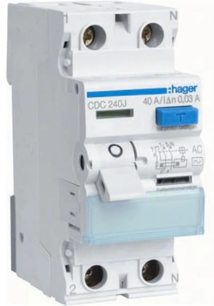 Wyłącznik różnicowoprądowy 40A, 30mA, 2 biegunowy, typ AC o numerze katalogowym CDC240J w kategorii Wyłączniki różnicowoprądowe typ AC, Wyłączniki różnicowoprądowe. Produkt wyprodukowany przez markę HAGER.