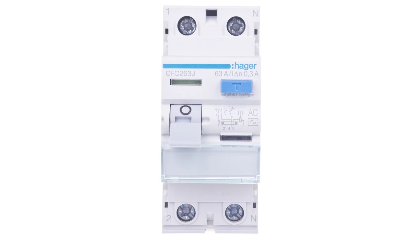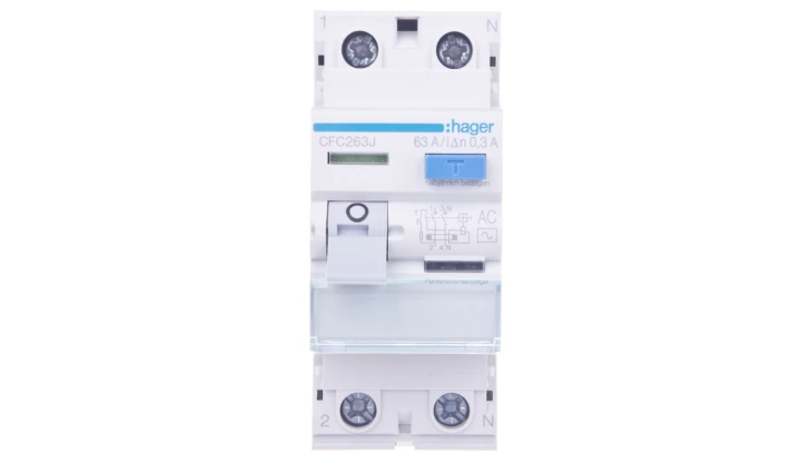 Wyłącznik różnicowoprądowy 1P+N 63A 300mA 6kA AC o numerze katalogowym CFC263J w kategorii Pozostałe, Niesklasyfikowane. Produkt wyprodukowany przez markę HAGER, seria RCCB.