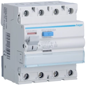 Wyłącznik różnicowoprądowy 63A, 30mA, 4 biegunowy, typ A o numerze katalogowym CDA463J w kategorii Wyłączniki różnicowoprądowe typ A, Wyłączniki różnicowoprądowe. Produkt wyprodukowany przez markę HAGER.
