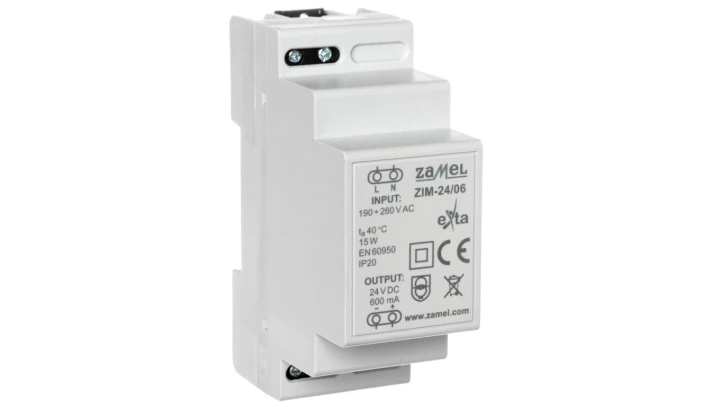 Zasilacz impulsowy 24V DC 0,6A TYP: ZIM-24/06 o numerze katalogowym EXT10000163 w kategorii Zasilacze i transformatory, Aparatura sterująca. Produkt wyprodukowany przez markę ZAMEL, seria EXTA.