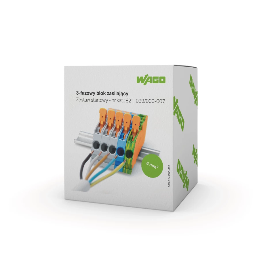 zestaw do układów trójfazowych; z pomarańczową ścianką końcową; z 2-przewodowymi złączkami listwowymi; z dźwignią i przyciskami; 6 mm²; Push-in CAGE CLAMP®; 6,00 mm²; żłt-ziel/niebieski/szary