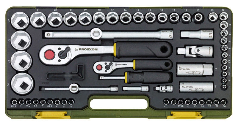 Zestaw kluczy nasadowych Proxxon 1/2 i 1/4 cala [65 el.] o numerze katalogowym   PR23286 w kategorii Klucze>Klucze nasadowe. Produkt wyprodukowany przez markę PROXXON.