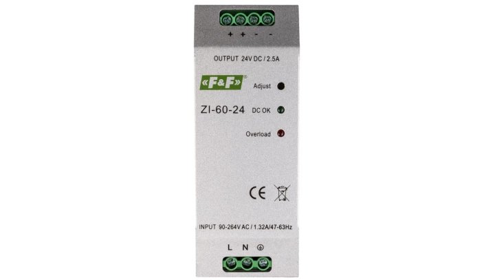 Zasialacz impulsowy przemysłowy nap. wej. 90÷264v ac/120÷370v dc, p=60w nap. wyj. 24v dc ZI-60-24V o numerze katalogowym ZI-60-24V w kategorii Zasilacze na szynę DIN, Zasilacze. Produkt wyprodukowany przez markę F&F.