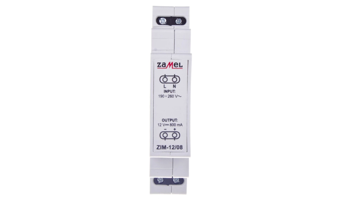 Zasilacz impulsowy 12V DC 0,8A TYP: ZIM-12/08 o numerze katalogowym EXT10000158 w kategorii Zasilacze i transformatory, Aparatura sterująca. Produkt wyprodukowany przez markę ZAMEL, seria EXTA.