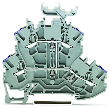 złączka 2-piętrowa; złączka przelotowa 4-przewodowa; L; z podstawką oznacznika; do zastosowań Ex e II; z mostkowaniem wewnętrznym; otwory na przewody z fiolet. nadrukiem; na szynę TS 35 x 15 i 35 x 7,5; 2,5 mm²; Push-in CAGE CLAMP®; 2,50 mm²; szary