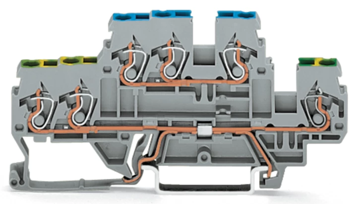 złączka 3-przewodowa 2-piętrowa; złączka PE/przelotowa; 2,5 mm²; PE/L; otwór na przew. żółto-zielony nadruk; na szynę TS 35 x 15 i 35 x 7,5; CAGE CLAMP®; 2,50 mm²; szary
