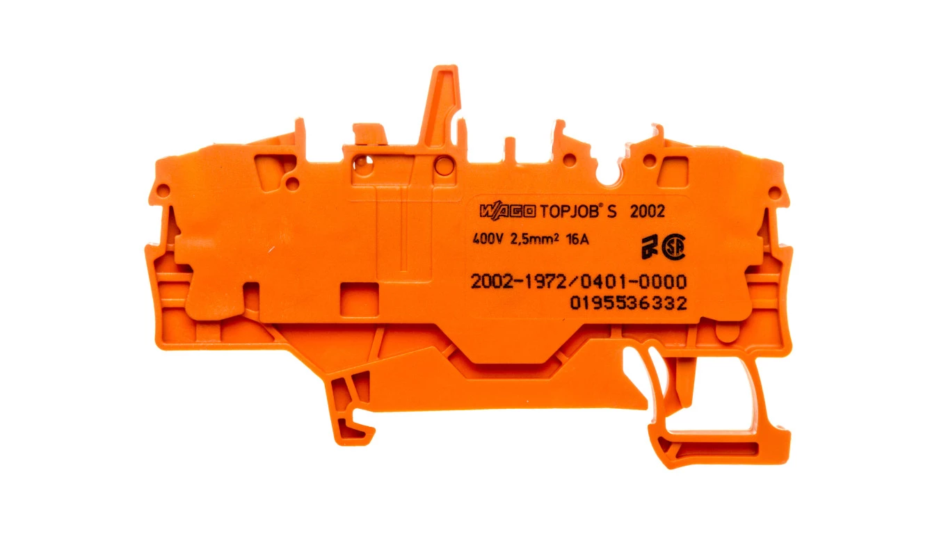 złączka rozłączalno-pomiarowa 2-przewodowa; z mechaniczną blokadą; z dodatkowym mostkowaniem; uchwyt łącznika nożowego pomarańczowy; na szynę TS 35 x 15 i 35 x 7,5; 2,5 mm²; Push-in CAGE CLAMP®; 2,50 mm²; pomarańczowy