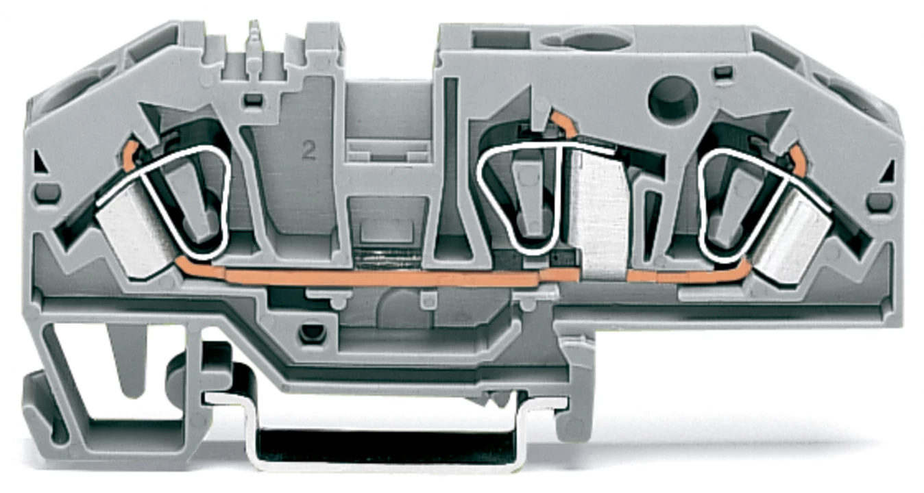 złączka przelotowa 3-przewodowa; 6 mm²; z możliwością pomiaru; o kształcie złączki rozłączalnej 3-przewodowej; opis na środku; na szynę TS 35 x 15 i 35 x 7,5; CAGE CLAMP®; 6,00 mm²; szary