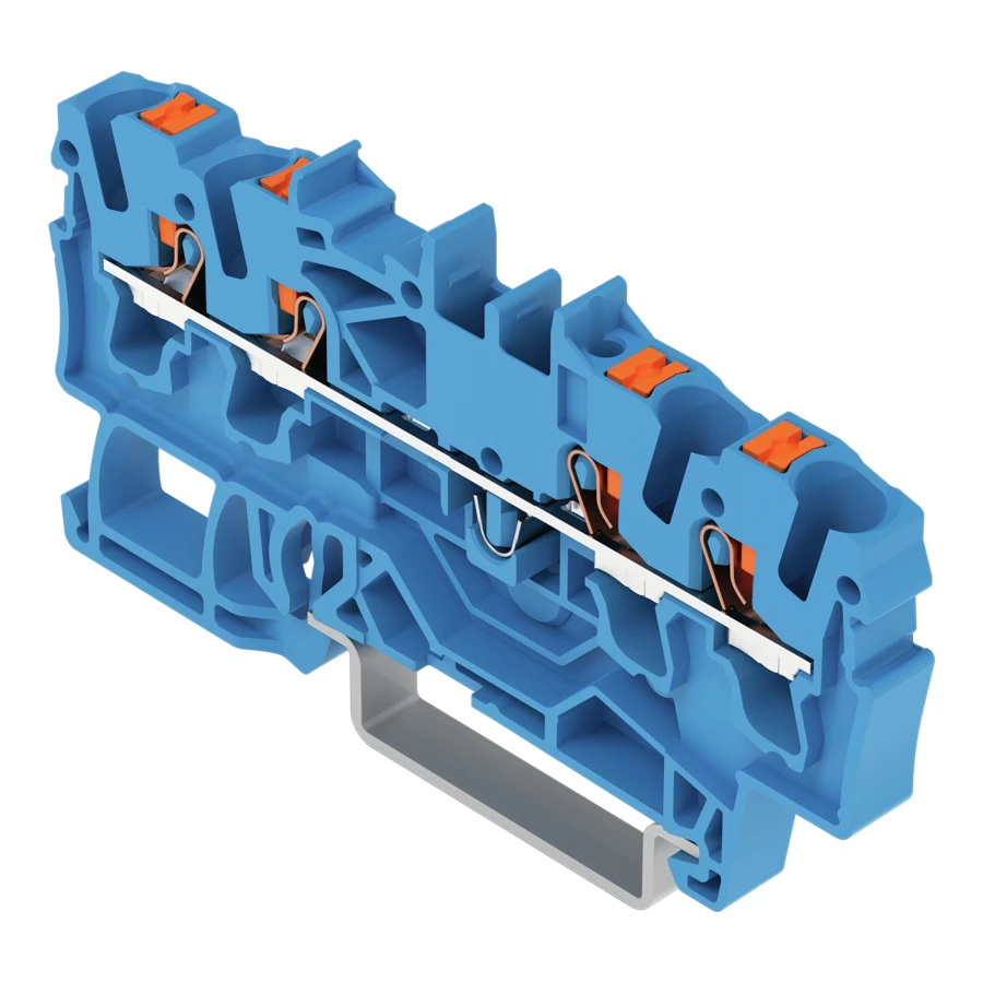 złączka przelotowa 4-przewodowa; z przyciskami; 2,5 mm²; z otworem pomiarowym; do zastosowań Ex i; opis z boku i na środku; na szynę TS 35 x 15 i 35 x 7,5; Push-in CAGE CLAMP®; 2,50 mm²; niebieski