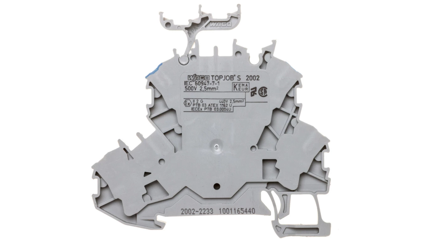 złączka 2-piętrowa; złączka przelotowa/przelotowa; L/N; z podstawką oznacznika; do zastosowań Ex e II; otwory na przewody piętro, nadruk nieb.; na szynę TS 35 x 15 i 35 x 7,5; 2,5 mm²; Push-in CAGE CLAMP®; 2,50 mm²; szary